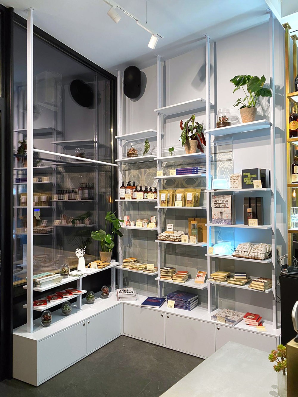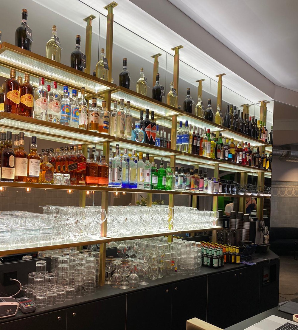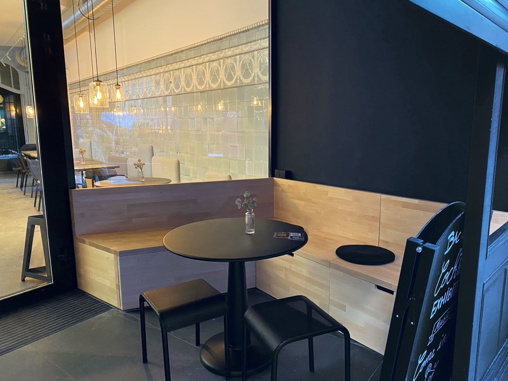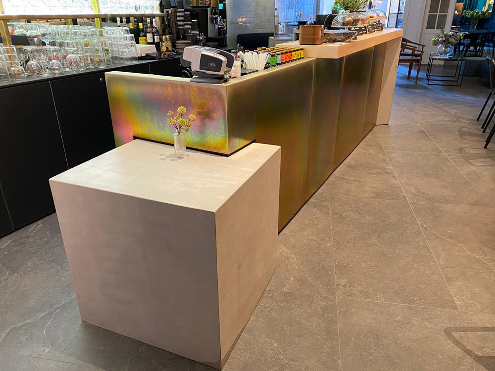 Aménagement du Restaurant le Passéo à Bruxelles. Réalisation du bar en béton ciré, le l'arrière bar, de l'espace boutique et du mobilier de la salle et de la terrasse.