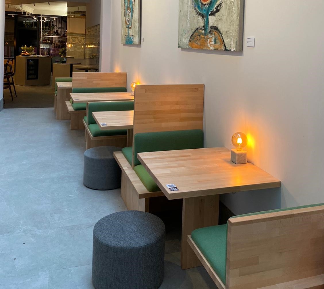Réalisation du mobilier salle: banquettes et tables en hêtre abouté et selleries
