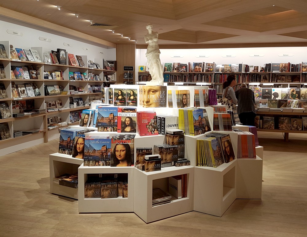 La fleur en résine et laque que vous pourrez admirer au centre de la librairie boutique du Musée du Louvre a monopolisé tout le savoir-faire de l’équipe. Un beau défi, associé à la réalisation de l’ensemble du mobilier de la boutique.