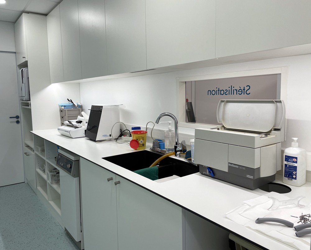 Mobilier sur mesure en mélaminé et plan de travail en stratifié compact.