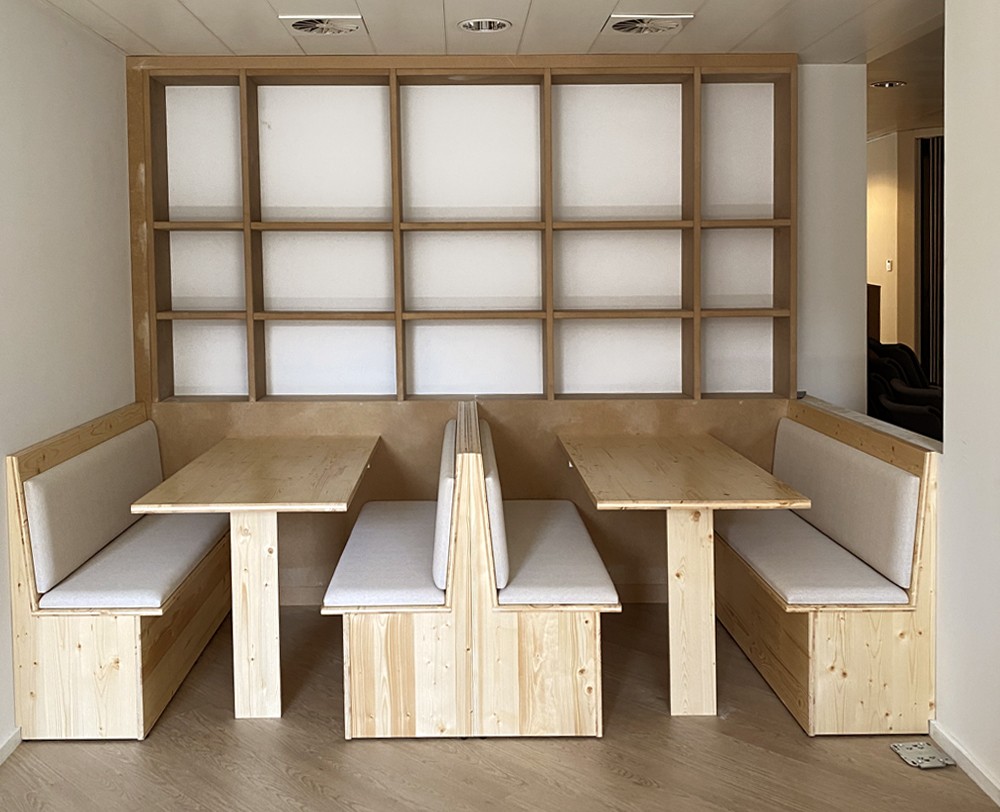 Réalisation de banquettes et tables en 3 plis sapin, avec selleries tissus
