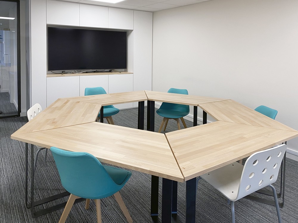 Aménagement d'une salle de réunion avec un meuble mural permettant d'intégrer un écran et des rangements, mais surtout, des tables modulables. Dessinées en trapèze, ces tables permettent de multiples configurations d'agencement, en fonction des besoins: une grande table pour 6, ou plusieurs tables de 2 à 4 personnes.