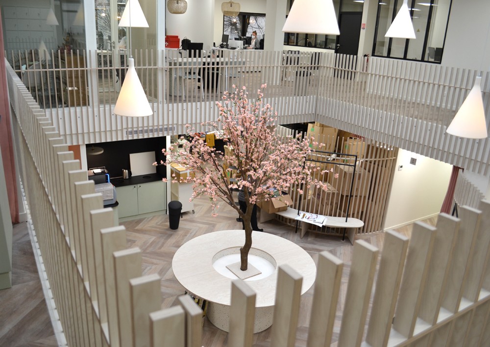 Conception et réalisation d'une table atrium avec arbre intégré. réalisation de 27m de garde corps et 30m de claustra coordonnés