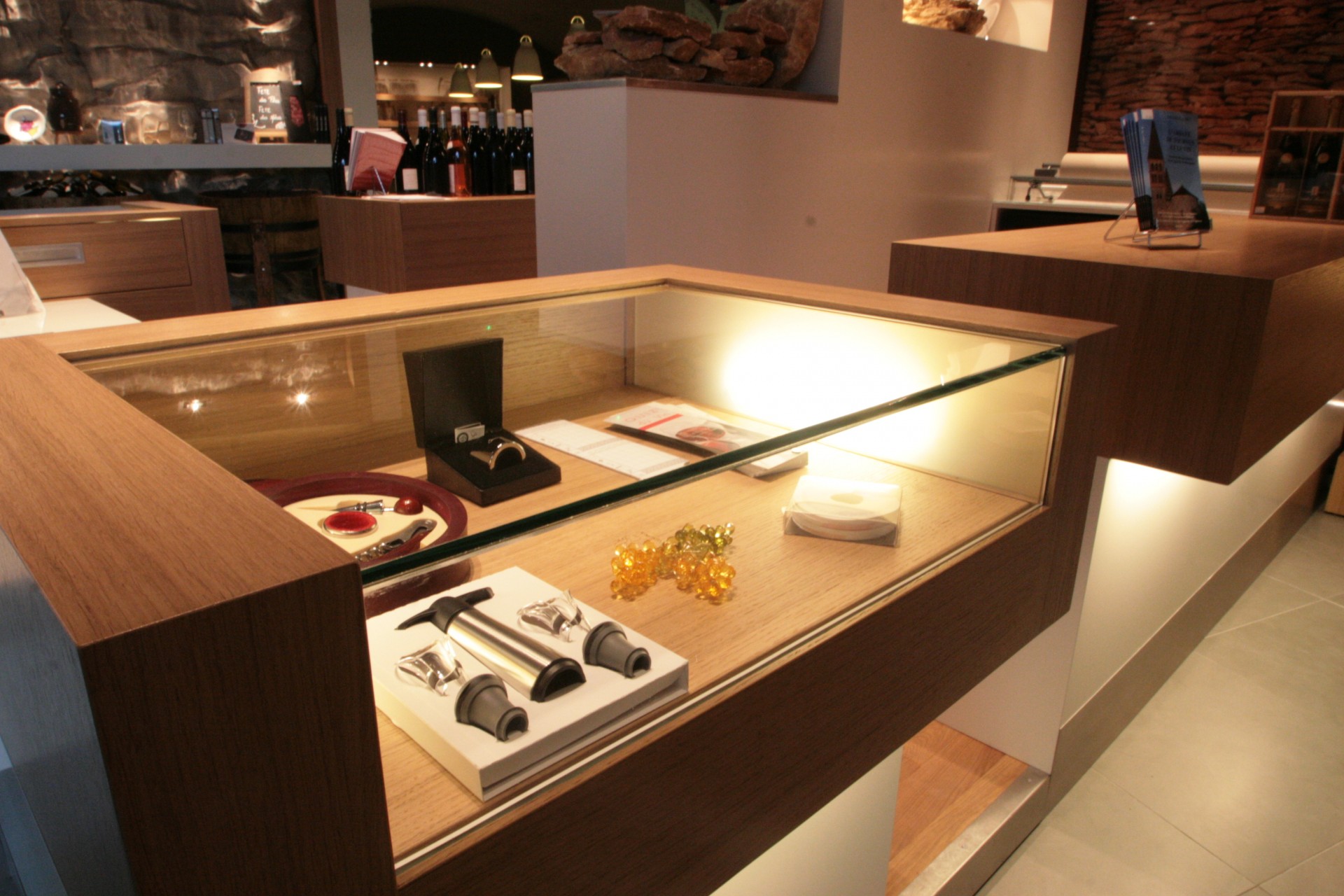 Conception et réalisation des vitrines, en bois et verre